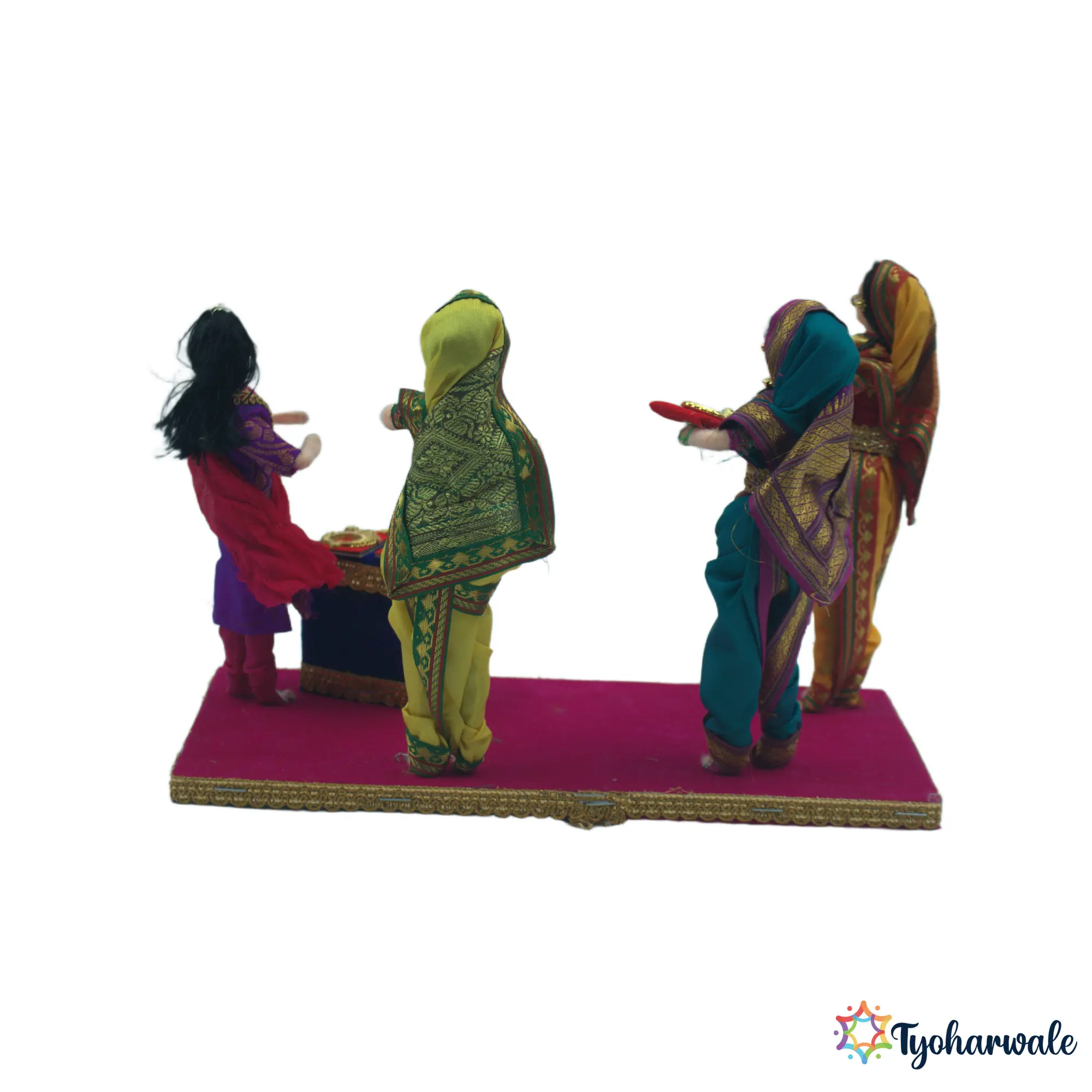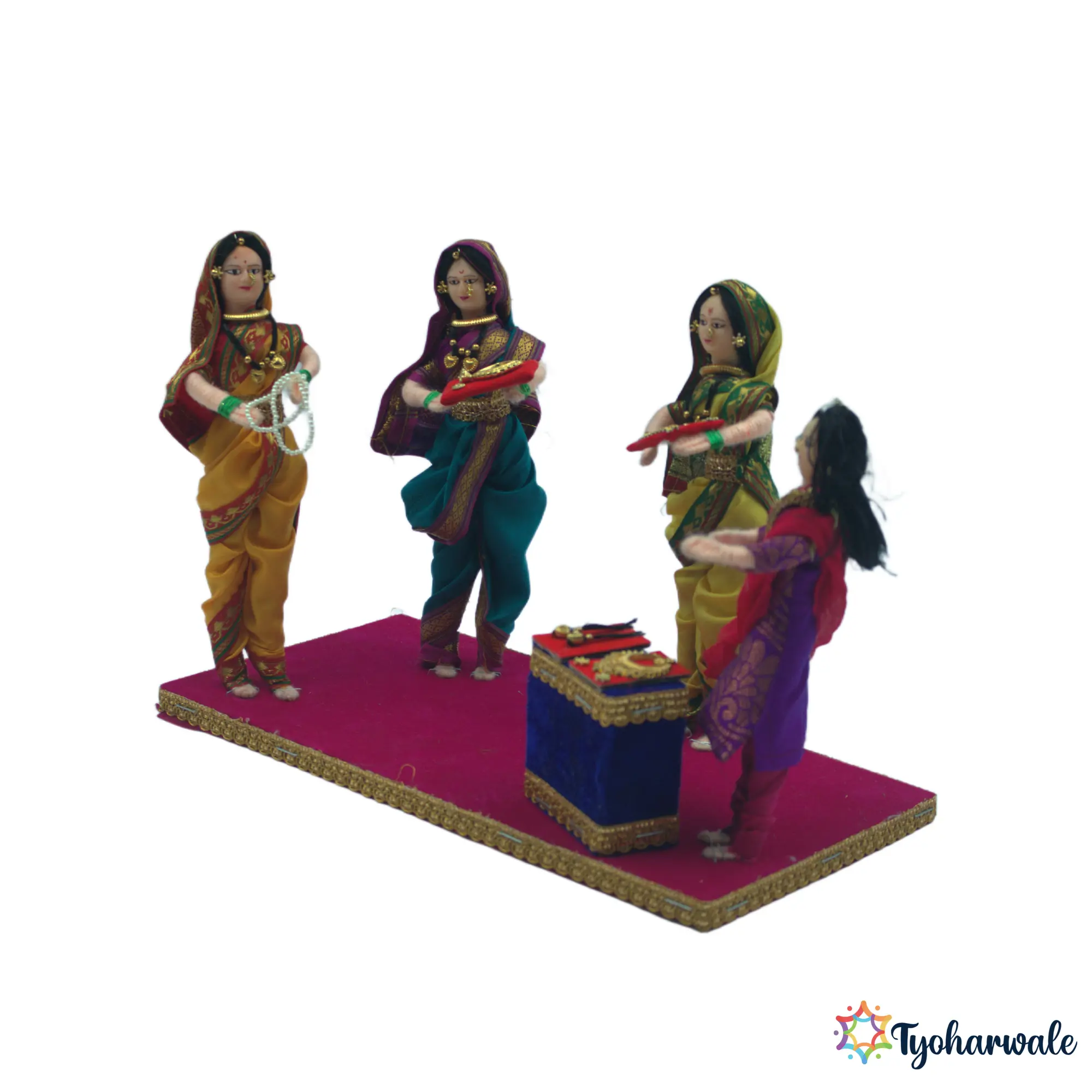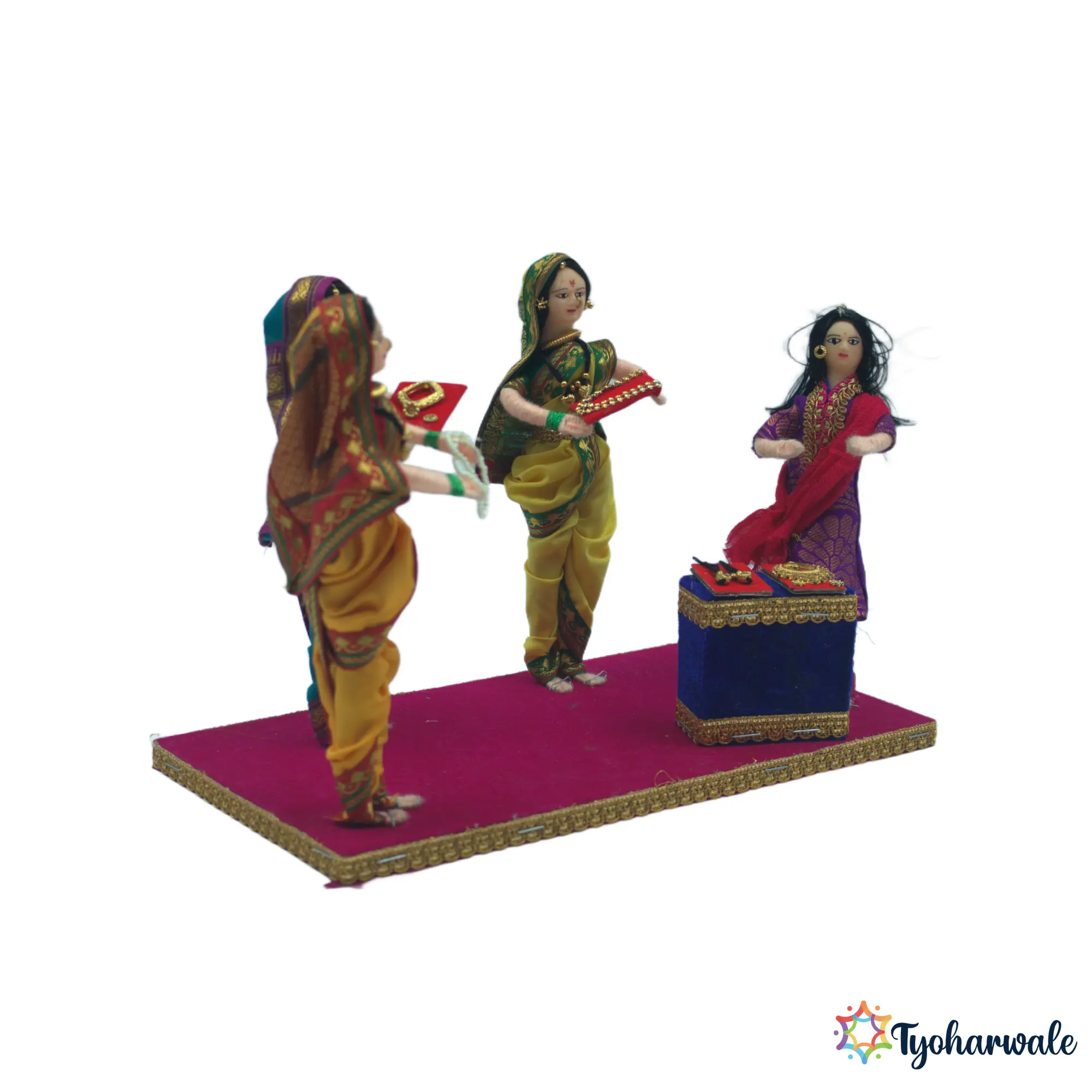 The sone kharedi figurine scene represents a classic pre-wedding custom where family members gather to select ornaments for the bride. Used as a rukwat showpiece, it visually highlights one of the important preparation rituals that form part of Maharashtrian wedding traditions. This traditional wedding doll arrangement is often positioned with other symbolic pieces that together illustrate cultural moments leading up to the ceremony.