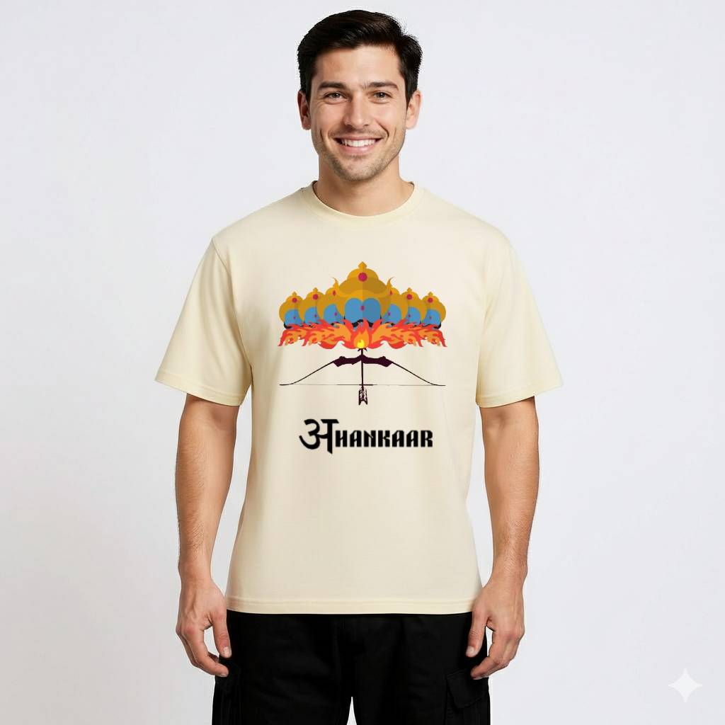 Product Description and Fit: This T-shirt features Ravana Theme Design with words Ahakaar. It has an oversize, relaxed fit that is comfortable for everyday wear.