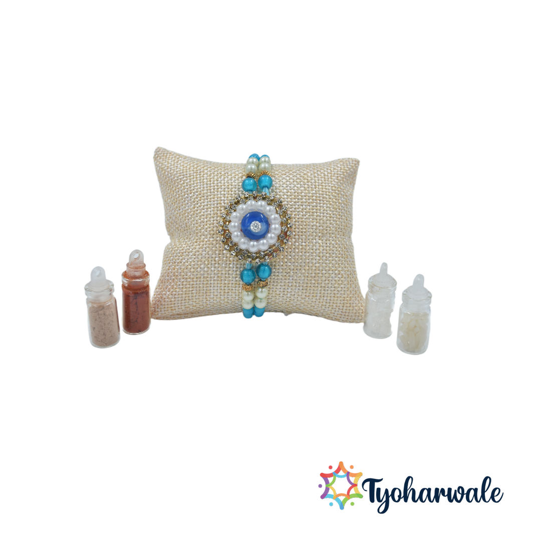 This Blue Moti Rakhi has a beautiful design of pearls engraved on the rakhi is a blend of tradition and style, perfect for celebrating Raksha Bandhan with a traditional touch. This rakhi is lightweight and comfortable to wear. It features vibrant colour of cotton thread and kundan work on the rakhi. This moti rakhi design adds a classic touch, perfect for all ages, for your older brother, younger brother. It’s a designer rakhi for all protective bhaiya.