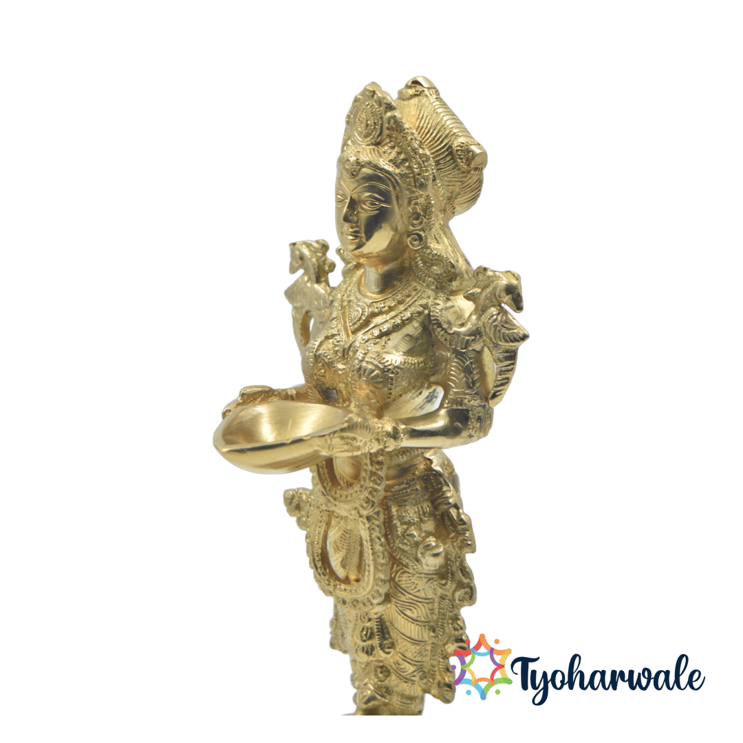This brass Laxmi lamp features Goddess Laxmi or Meenakshi Devi holding a diya, symbolizing wealth, abundance, and spiritual illumination. The standing lady design with oil lamp serves as an elegant decorative piece for home decor, pooja rituals, or festive celebrations. Ideal for Diwali puja, Lakshmi Puja, or Vastu-inspired home decorations, this brass diya enhances the beauty and sacredness of your space.