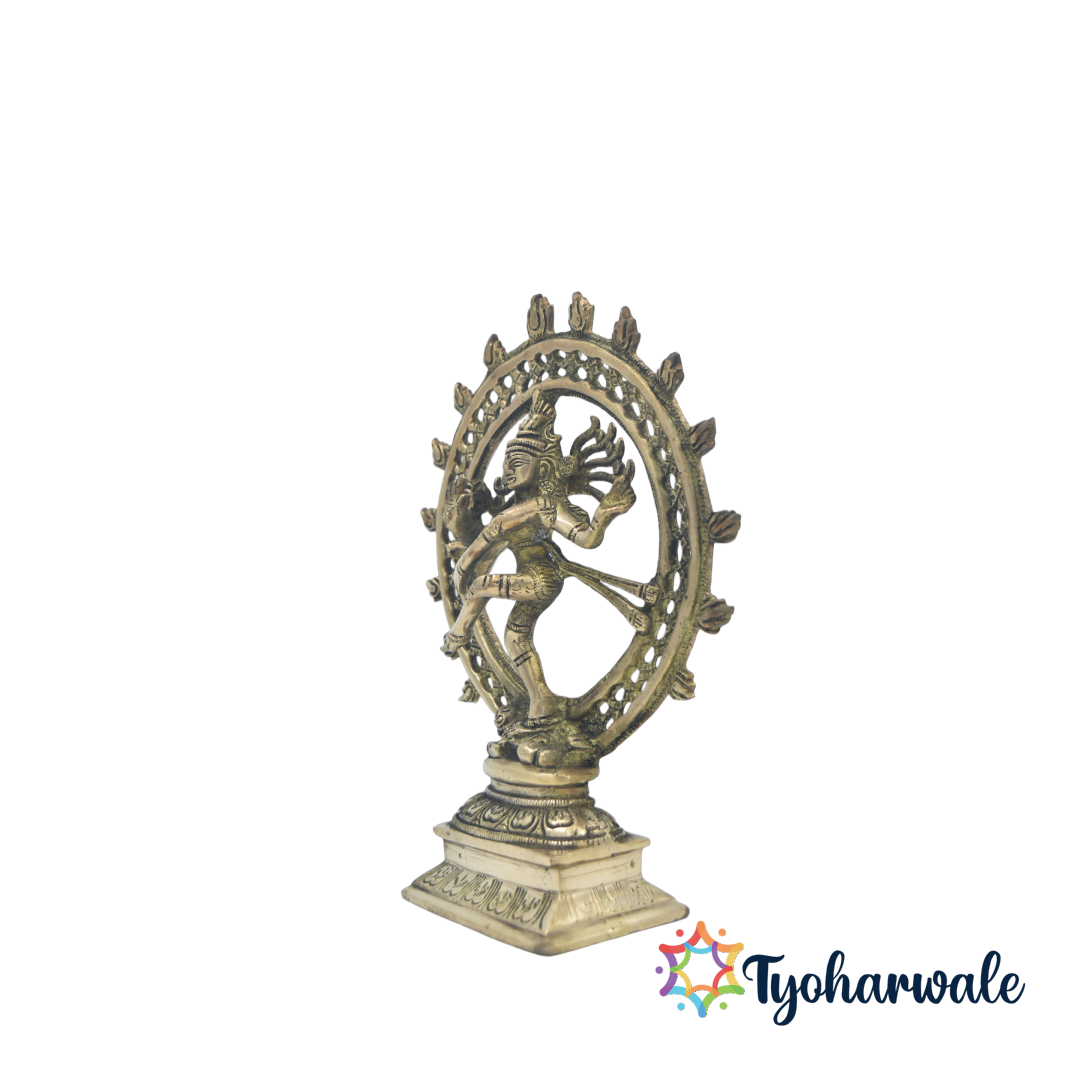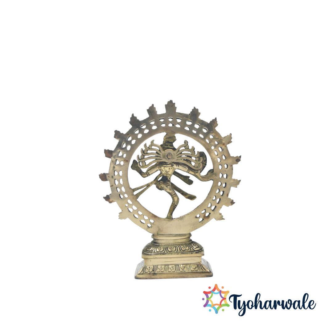 This golden-colored brass Nataraja idol is a symbolic home décor piece, suitable for temple decoration, office décor, or meditation spaces. It serves as a Vastu idol, Shiva statue, Nataraja sculpture, Lord Shiva murti, and decorative art piece that adds elegance and positivity to your surroundings. This detailed Shiva Nataraj murti is perfect for Diwali gifting, housewarming presents, spiritual ceremonies, and festival décor.Crafted from high-quality brass, this Shiva Natraj statue is durable, aesthetic, and lightweight for easy display on tables, shelves, or mandir altars. The Lord Shiva dancing sculpture symbolizes prosperity, wisdom, energy, and divine protection, making it a cherished home décor item, temple idol, and gift for devotees. Ideal for Diwali décor, puja essentials, festival celebrations, or sacred home decorations, this Shiva Nataraj murti brings a divine presence and spiritual charm wherever placed.