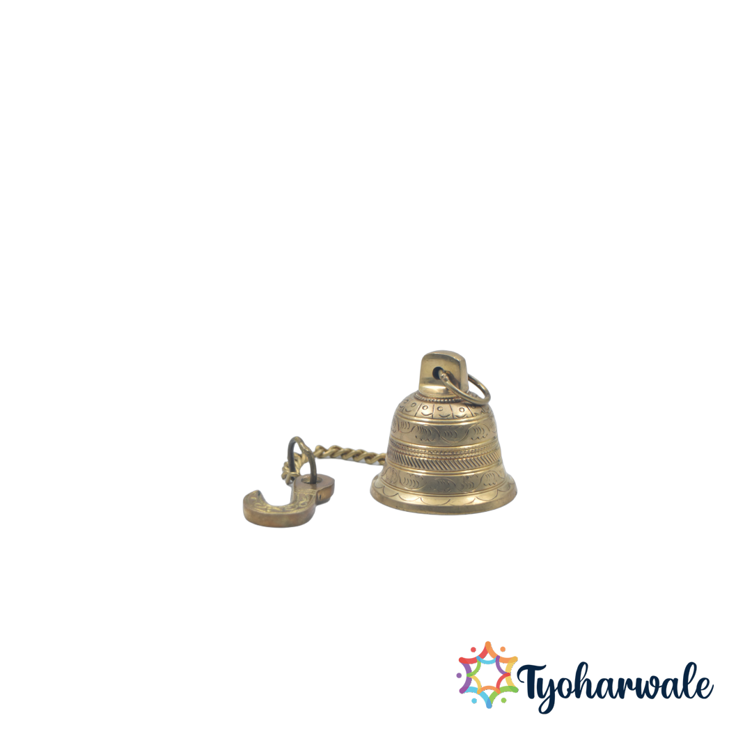 Enhance your home pooja mandir décor with this Brass Wall Hanging Bell with Chain, a perfect decorative ghanti for temple, mandir, living room, door, balcony, or porch decoration. Expertly crafted, this brass hanging bell is ideal for puja room rituals, religious ceremonies, and festive celebrations, bringing a divine ambiance to any spiritual space.