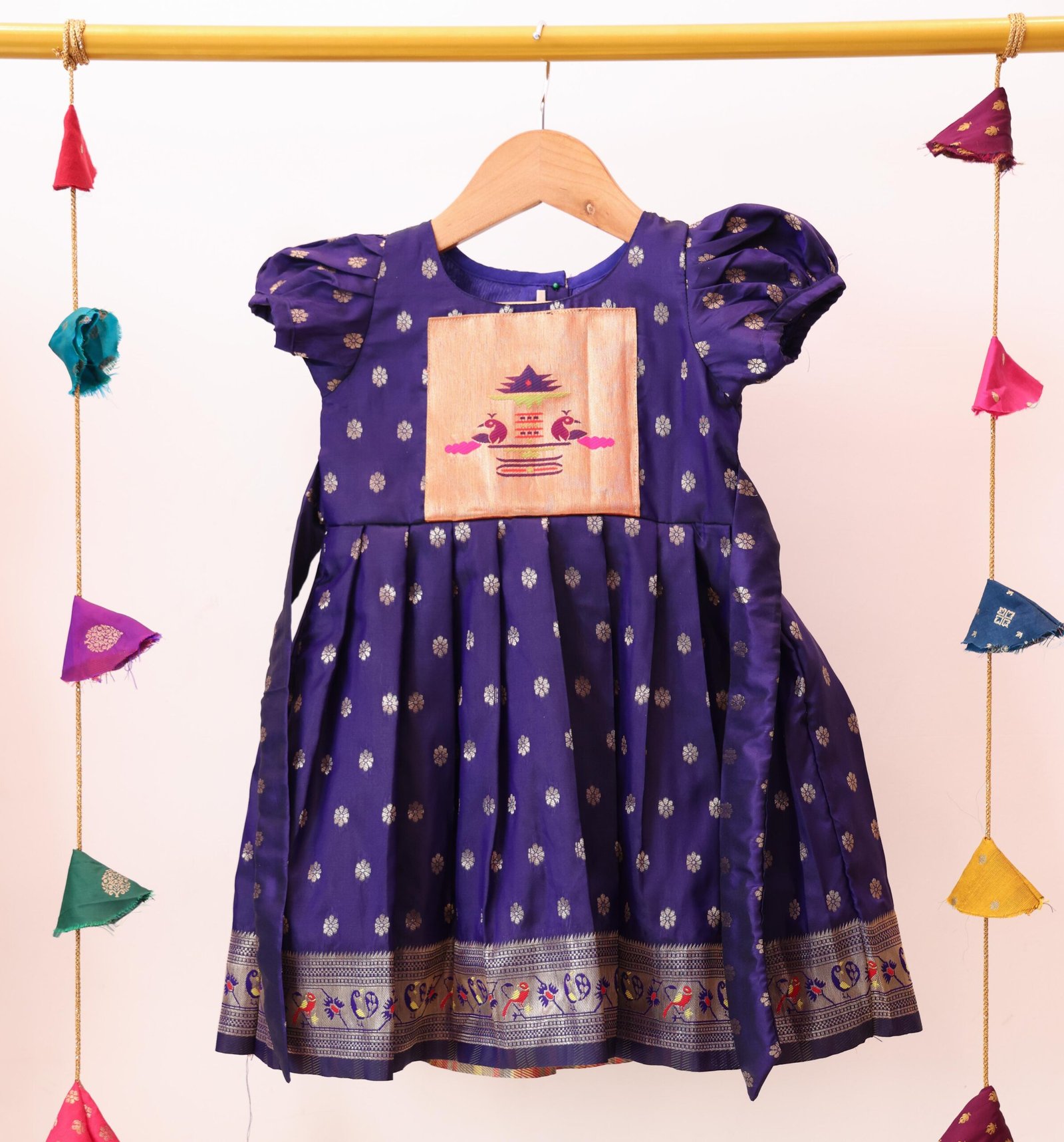 Dark Purple Paithani Border Ballon Sleeves Frock