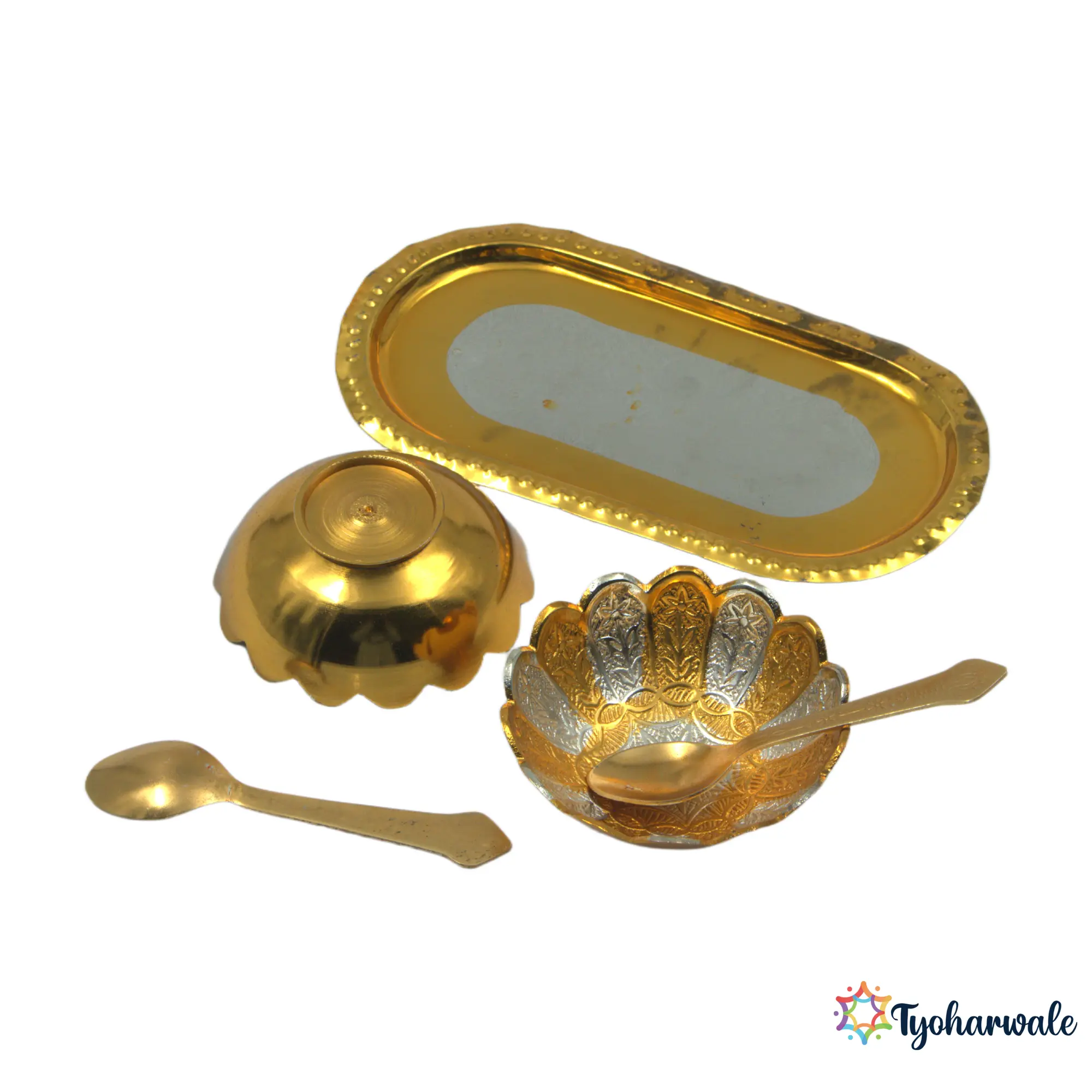 The bowl and spoon set offers a balanced combination of utility and presentation for Indian households. It can be used on dining tables, in pooja rooms, or as part of festive displays during special occasions. The coordinated design allows it to serve both practical and decorative purposes, making it suitable for everyday use as well as celebrations. It is often chosen as a gifting option for festivals, weddings, and office functions where traditional presentation is preferred.