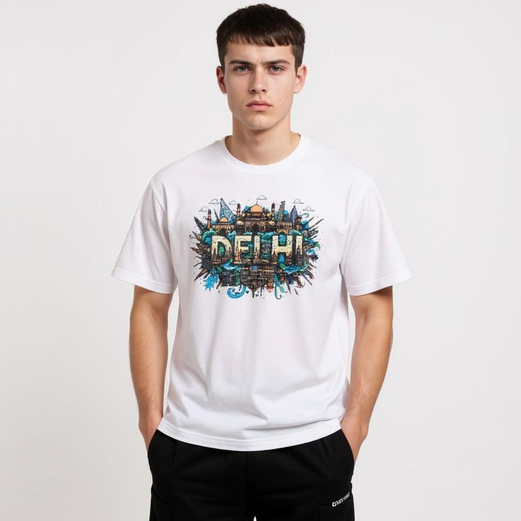 Product Description and Fit: This T-shirt features a vibrant and detailed graphic of Delhis cityscape. The design captures iconic landmarks and architectural elements, making it a standout piece. The garment fits true to size with a classic, relaxed fit.