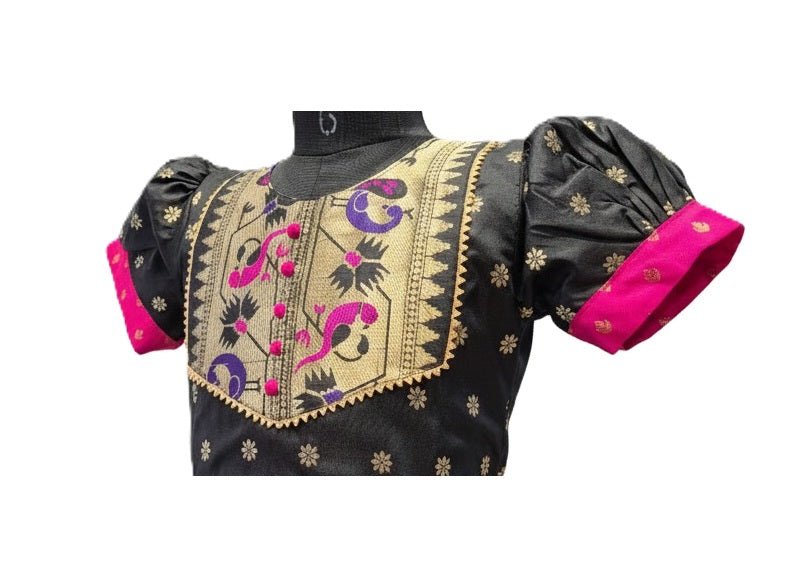 Designer Black Silk Frock with Gold Zari Yoke and Pink Brocade Detail