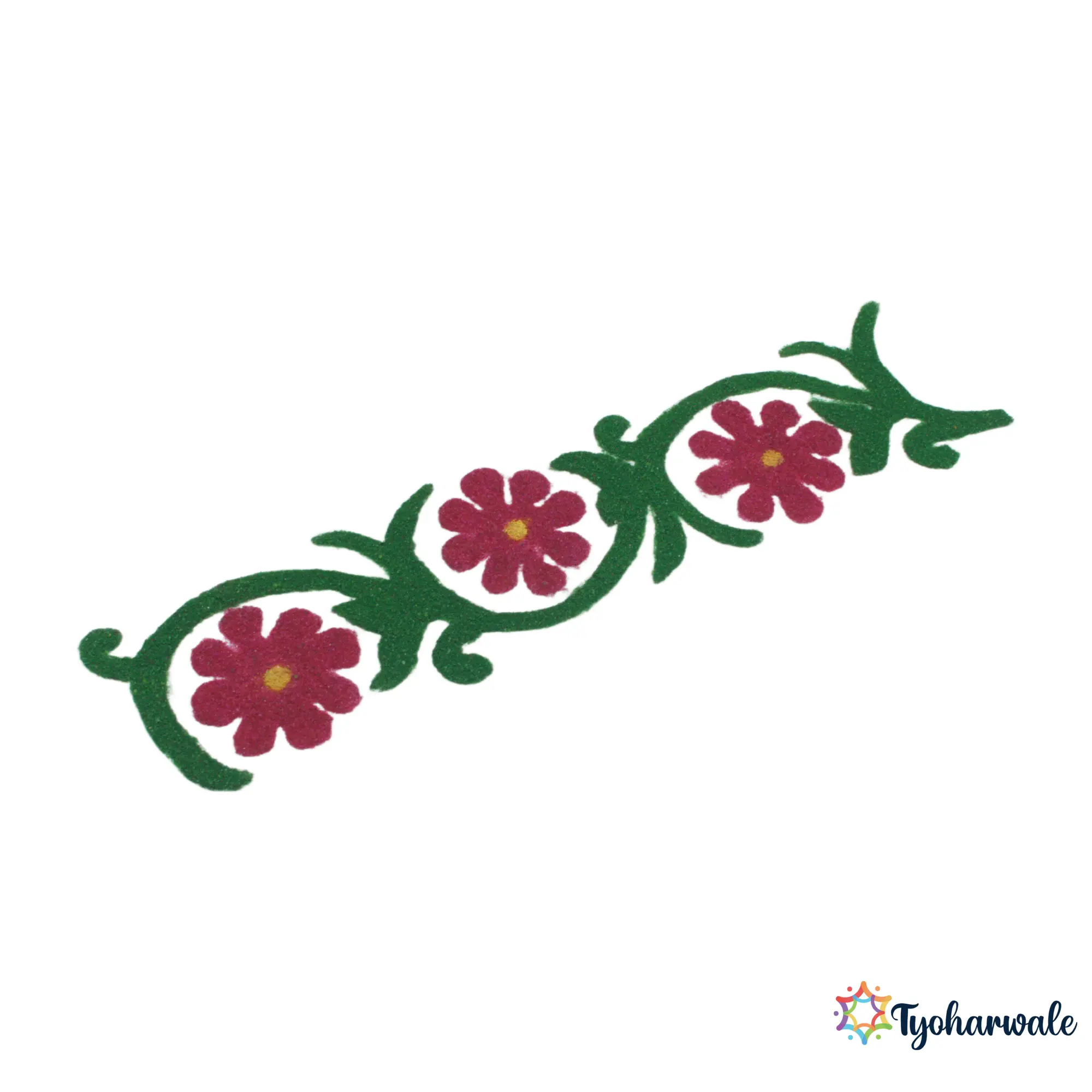This decorative rangoli works beautifully as a border design for main doors, apartment entrances, corridors, and mandir areas. The floral vine pattern is traditionally associated with freshness, prosperity, and celebration, making it suitable for weddings, temple decoration, and festive occasions. It can be placed along walls, near lamps, or used to frame larger rangoli setups, offering a neat and mess-free alternative to loose powders.