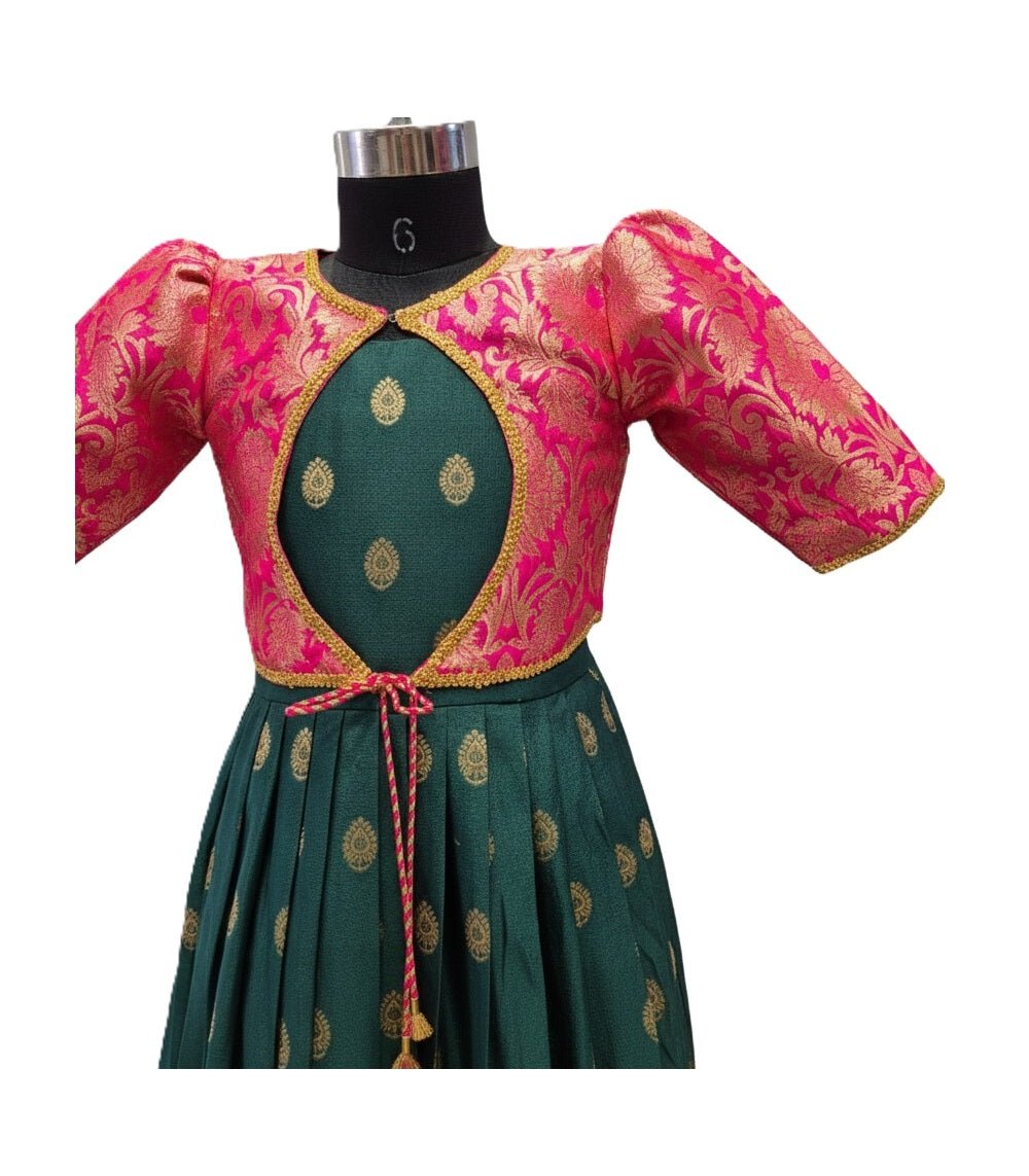 Girls’ Designer Bottle Green Silk dress Set with Removable Pink Brocade Jacket