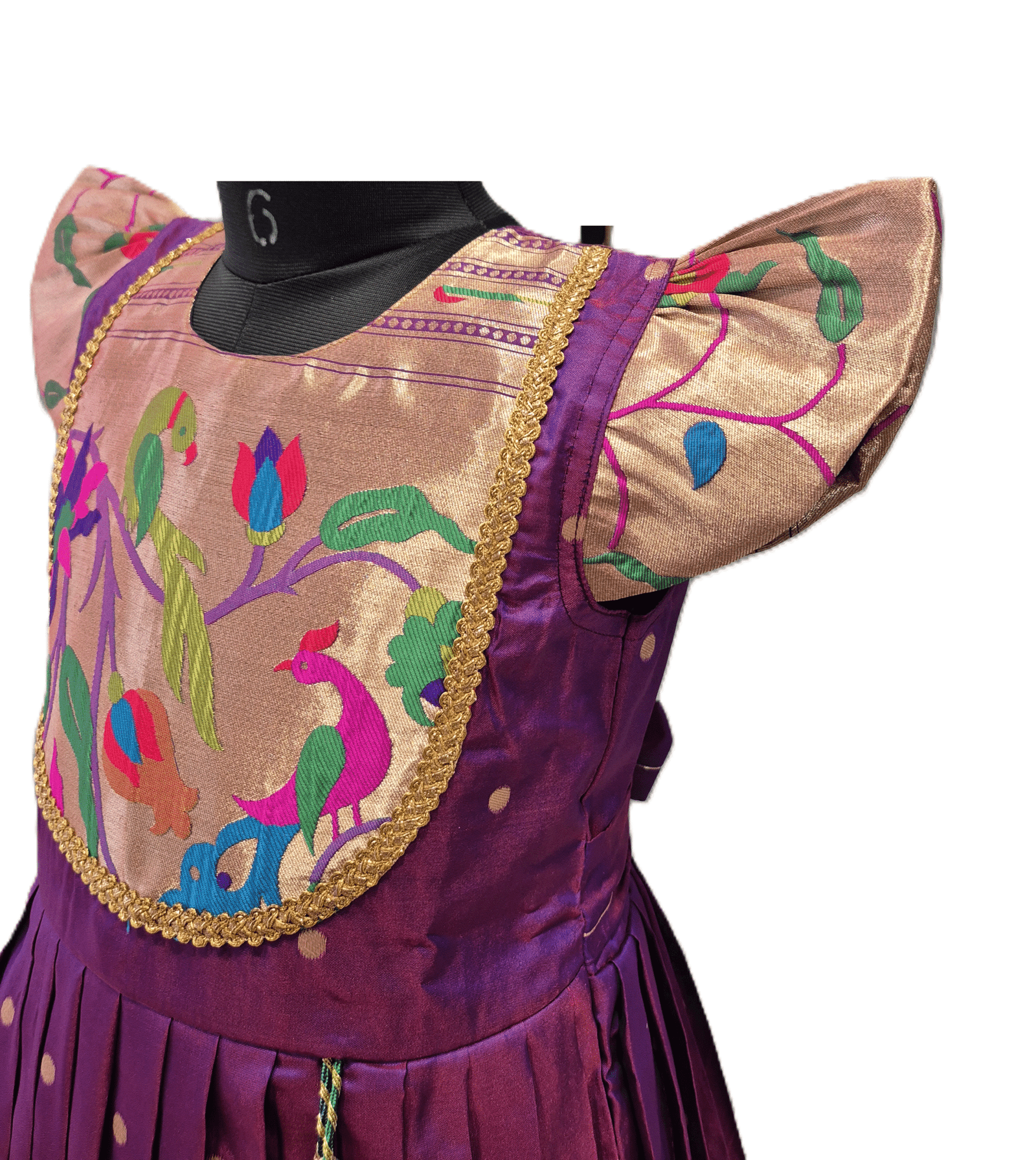 Girls’ Royal Purple & Gold Ethnic Frock with Paithani-Style Peacock Brocade