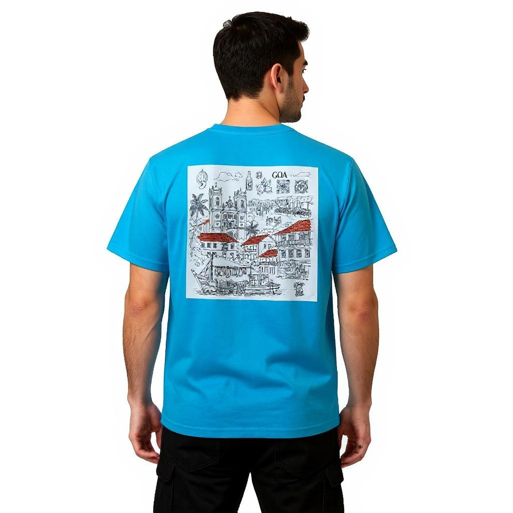 This T-shirt features a detailed sketch of Goa on the back, capturing the essence of the region. The shirt is designed with an oversize fit, offering a comfortable and relaxed wear.