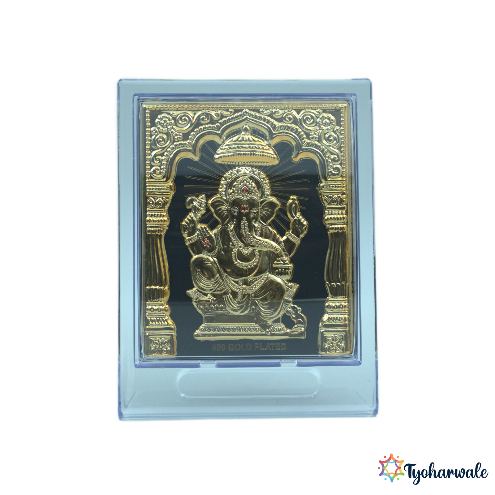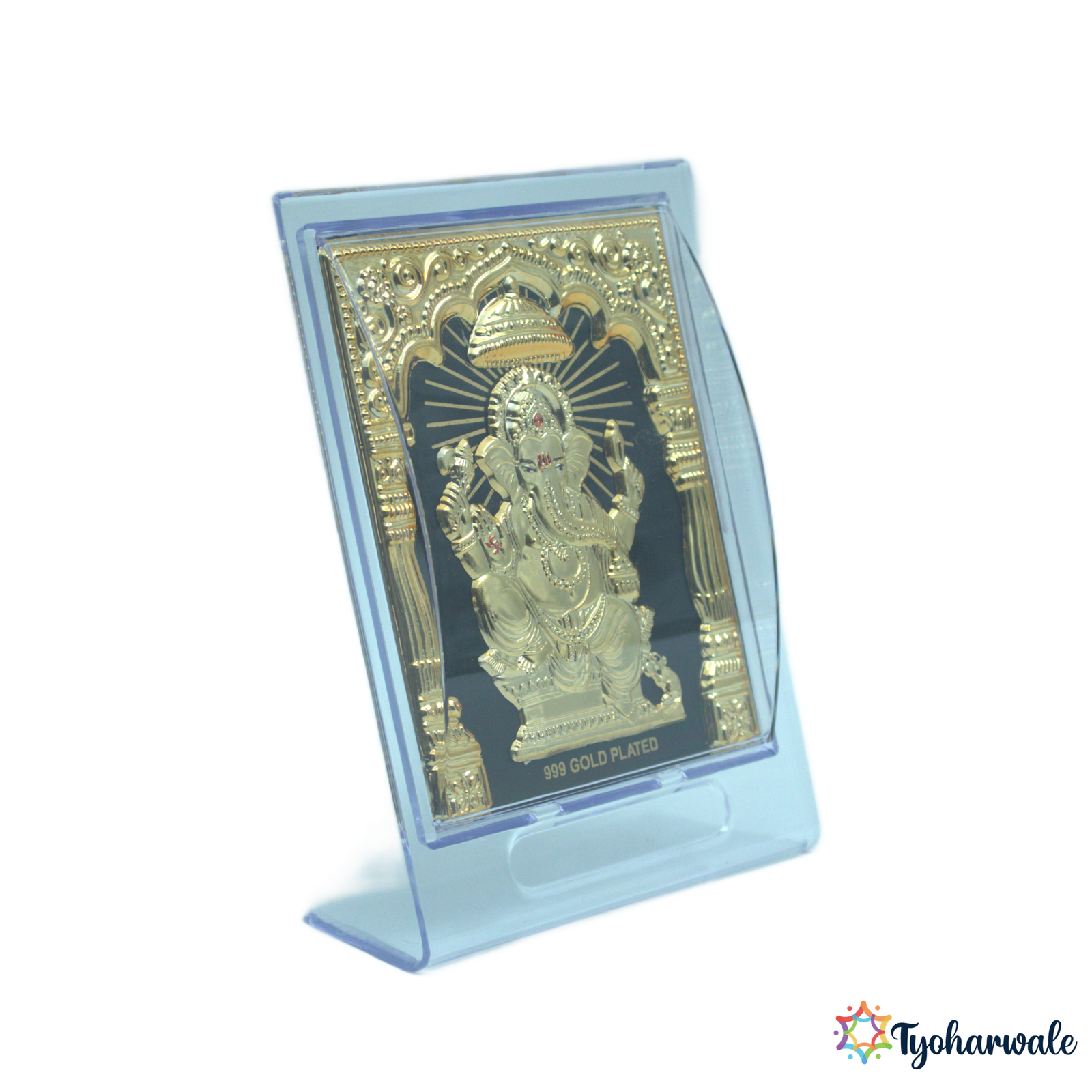 The Gold Plated Ganpati Frame is an excellent addition to your office or home desk. The Ganesha frame is made of a shiny silver frame attached to a wooden frame for long-lasting use. It is usually given as a religious gift on Diwali, as an idol frame for Ganesha at housewarmings, weddings, or poojas. Care should be taken to clean with a soft, dry cloth. Do not use chemical cleaners.