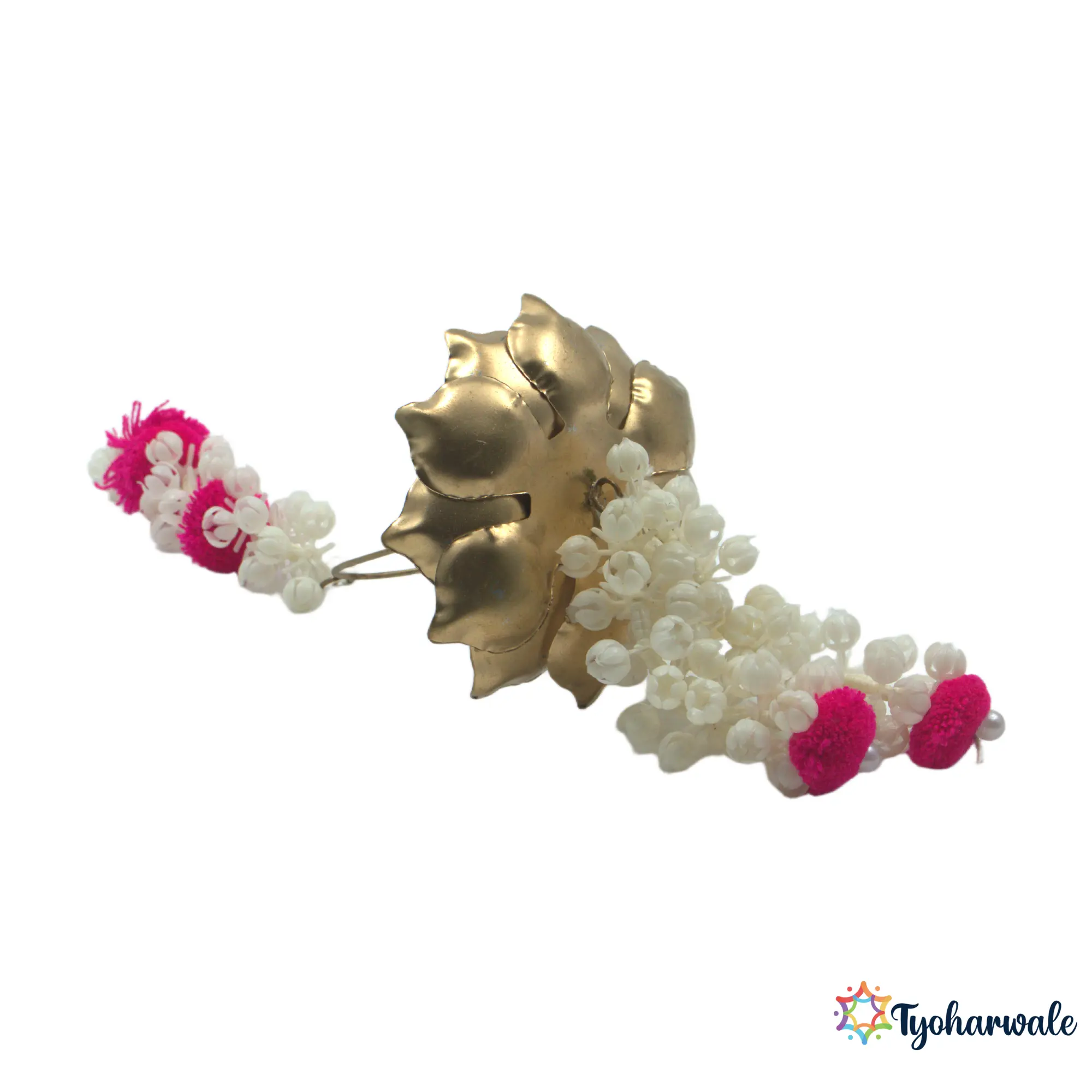 This hanging tealight with gajra, a perfect floral diya hanger for festive celebrations. This decorative candle holder has traditional floral beauty, making it ideal for pooja room decor and living spaces. The tealight hanging décor has a metallic holder decorated with artificial jasmine gajra. Whether for Diwali festivals or Navratri door hangings, this floral hanging tealight cultural warmth.
