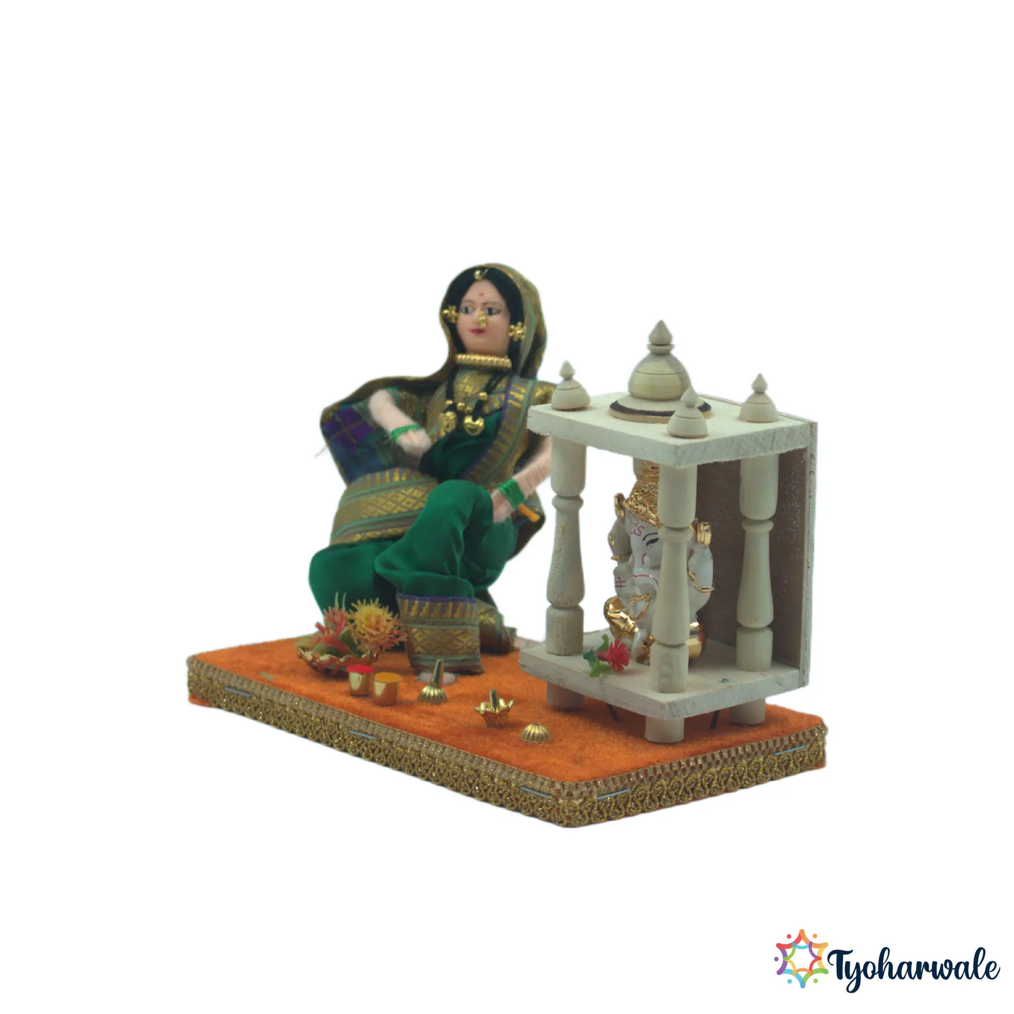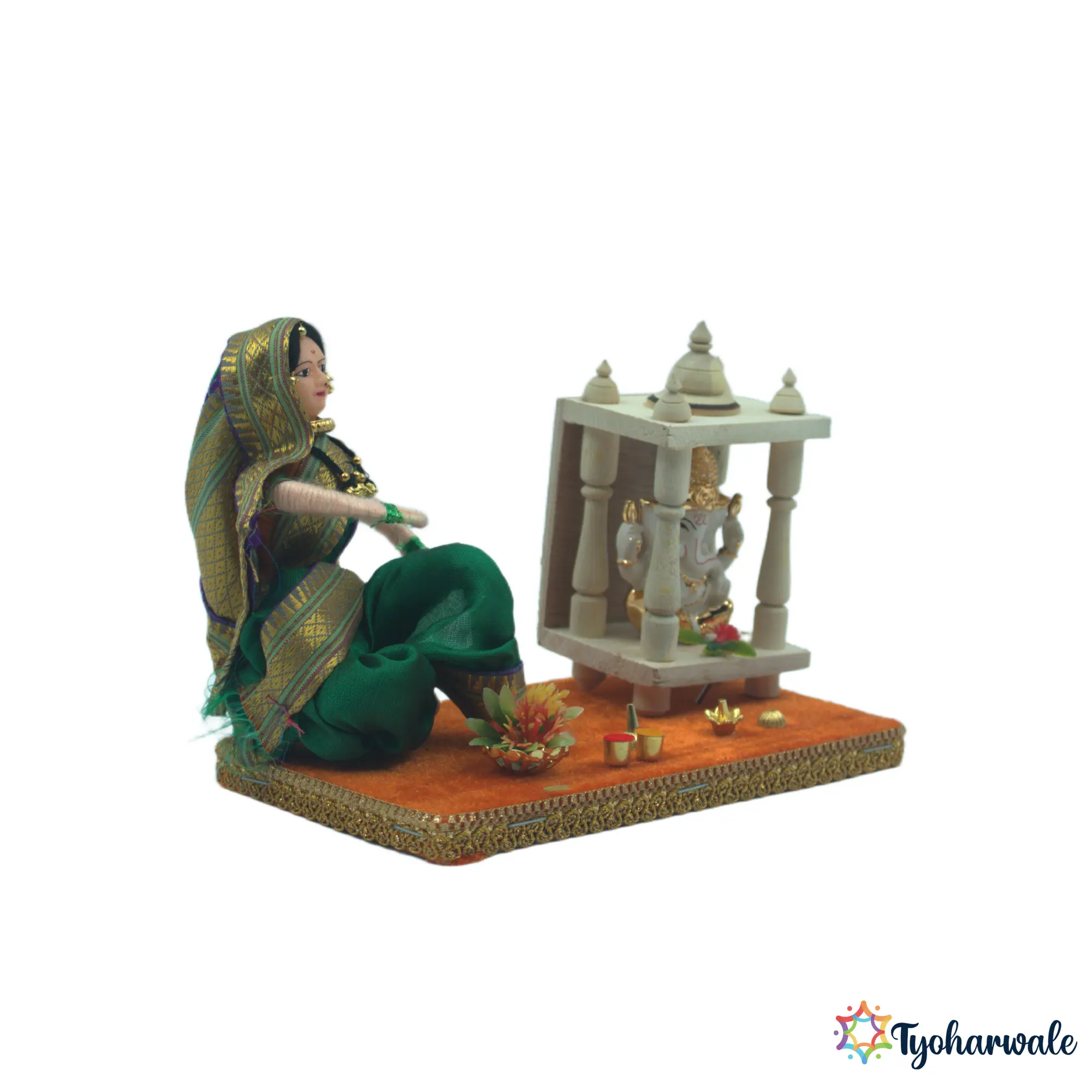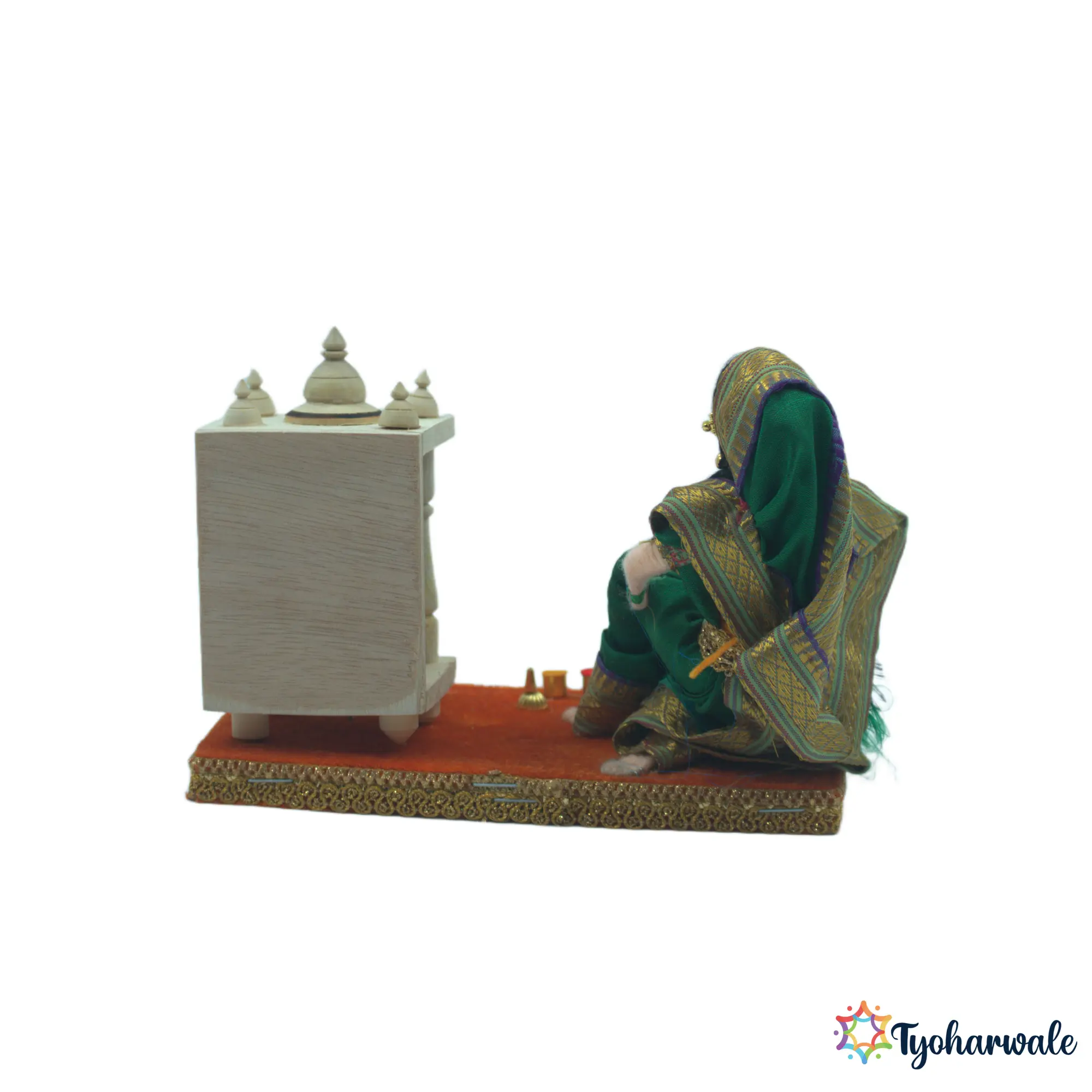 The lady doing pooja setup for wedding rukhwat highlights everyday worship that forms an important part of household traditions. Prayer is often included in rukhwat displays to reflect spiritual grounding during marriage ceremonies. Used as a traditional worship miniature for marriage ceremony, this piece adds religious context without dominating the setup. As rukhwat decor religious pooja setup, it supports cultural storytelling and balance within ceremonial arrangements. The miniature is suitable for traditional wedding decor, cultural displays, and ritual-based rukhwat presentations that aim to show family values and routine practices respectfully.