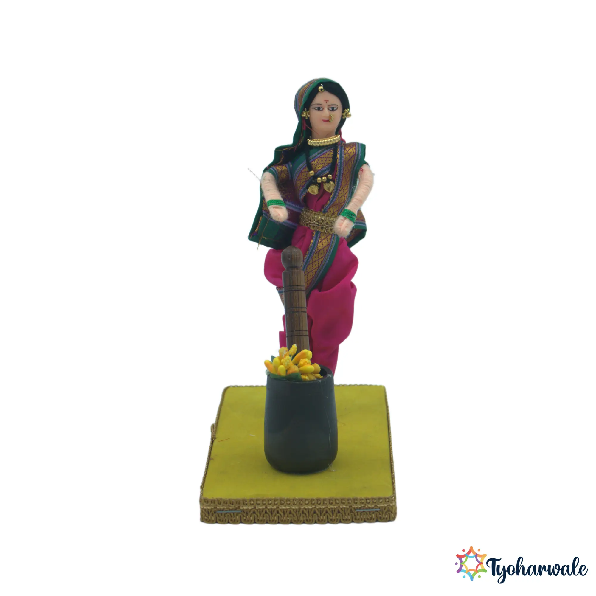 This lady with ukhal (उखळ) figurine represents traditional grain grinding activities carried out in Indian households. It is used in wedding rukhwat displays to symbolise household work and cultural kitchen practices followed in daily life.