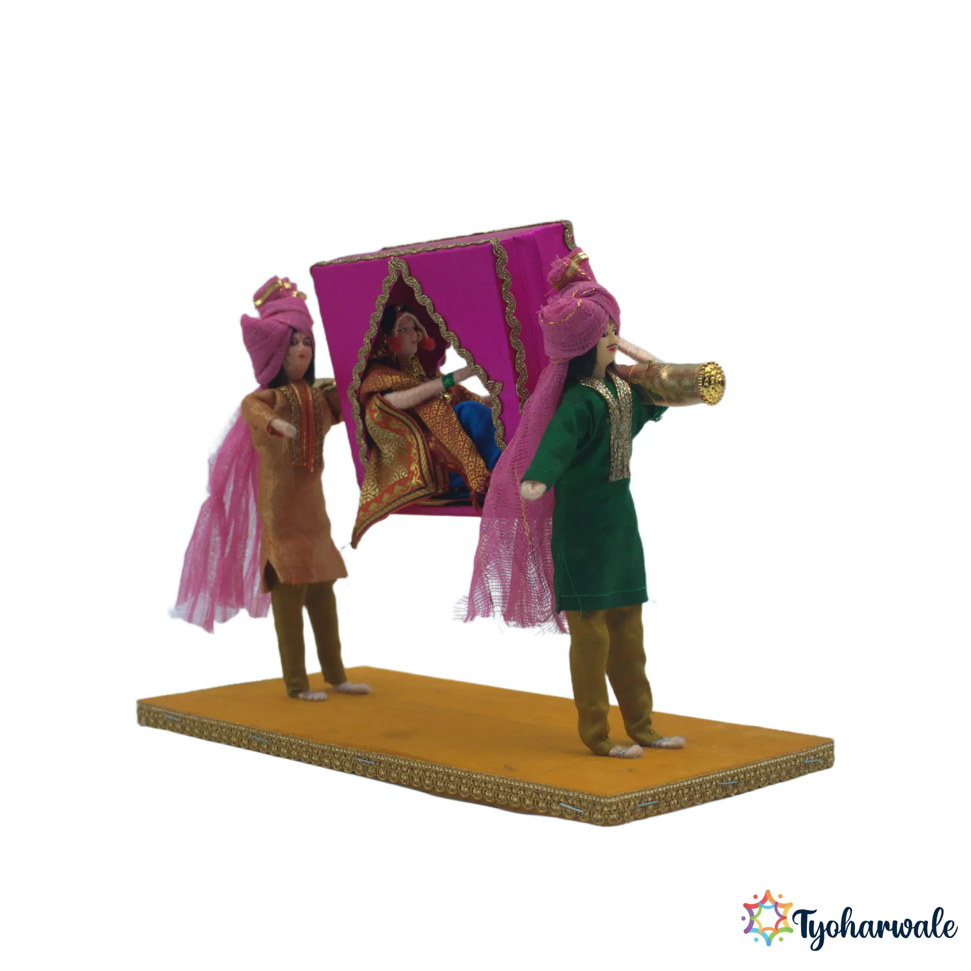 The lek chalali sasarla figurine scene visually represents the ceremonial departure of the bride, a meaningful ritual that marks the transition to married life. Used as a rukwat showpiece, it helps families present wedding traditions through storytelling elements within the display. This traditional wedding doll arrangement is typically positioned alongside symbolic items that reflect rituals, customs, and values associated with Maharashtrian marriages.