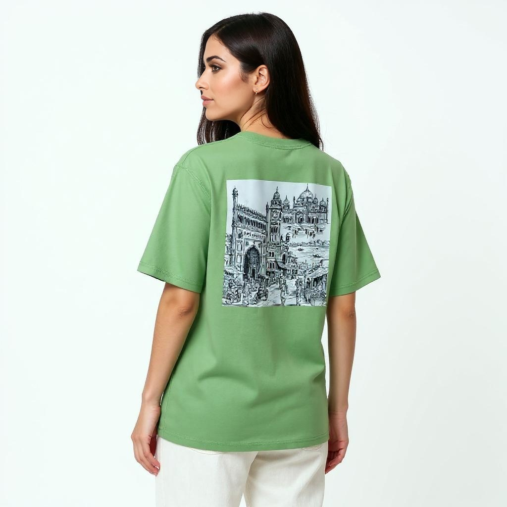 Product Description and Fit: This T-shirt features a detailed black and white illustration of a cityscape of Lucknow on the back, showcasing intricate architectural elements. The shirt has an oversize, classic fit that is comfortable for everyday wear.