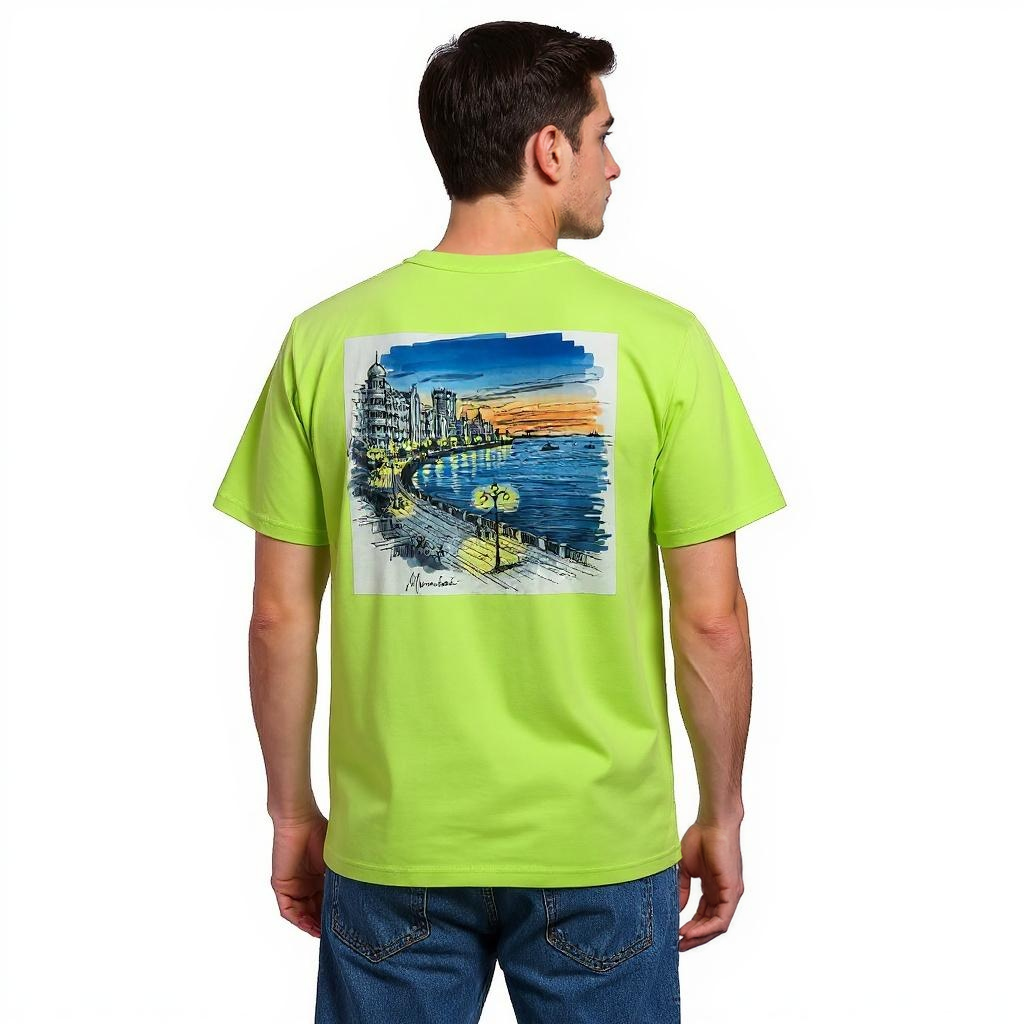 This T-shirt features a vibrant cityscape of Mumbai graphic on the back, showcasing a detailed urban scene with buildings and the marine drive. The shirt has an oversize, relaxed fit that is comfortable for everyday wear.