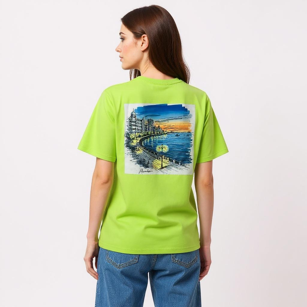 This T-shirt features a vibrant cityscape of Mumbai graphic on the back, showcasing a detailed urban scene with buildings and the marine drive. The shirt has an oversize, relaxed fit that is comfortable for everyday wear.
