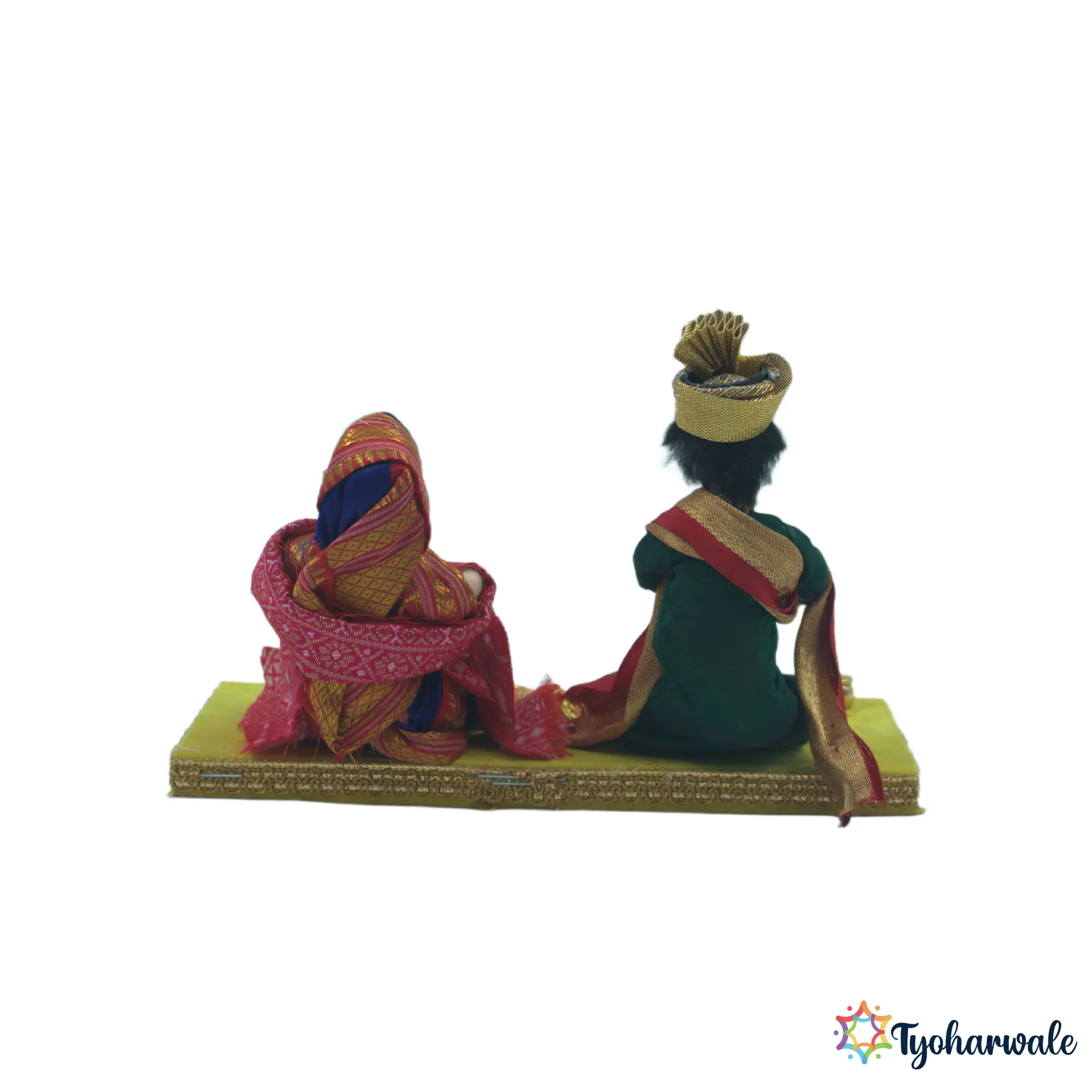 This navara navari (नवरानवरी) figurine shows the bride and groom sharing a meal. It is used in wedding rukhwat displays to symbolise togetherness and shared family life after marriage. The setup suits traditional wedding decor arrangements.