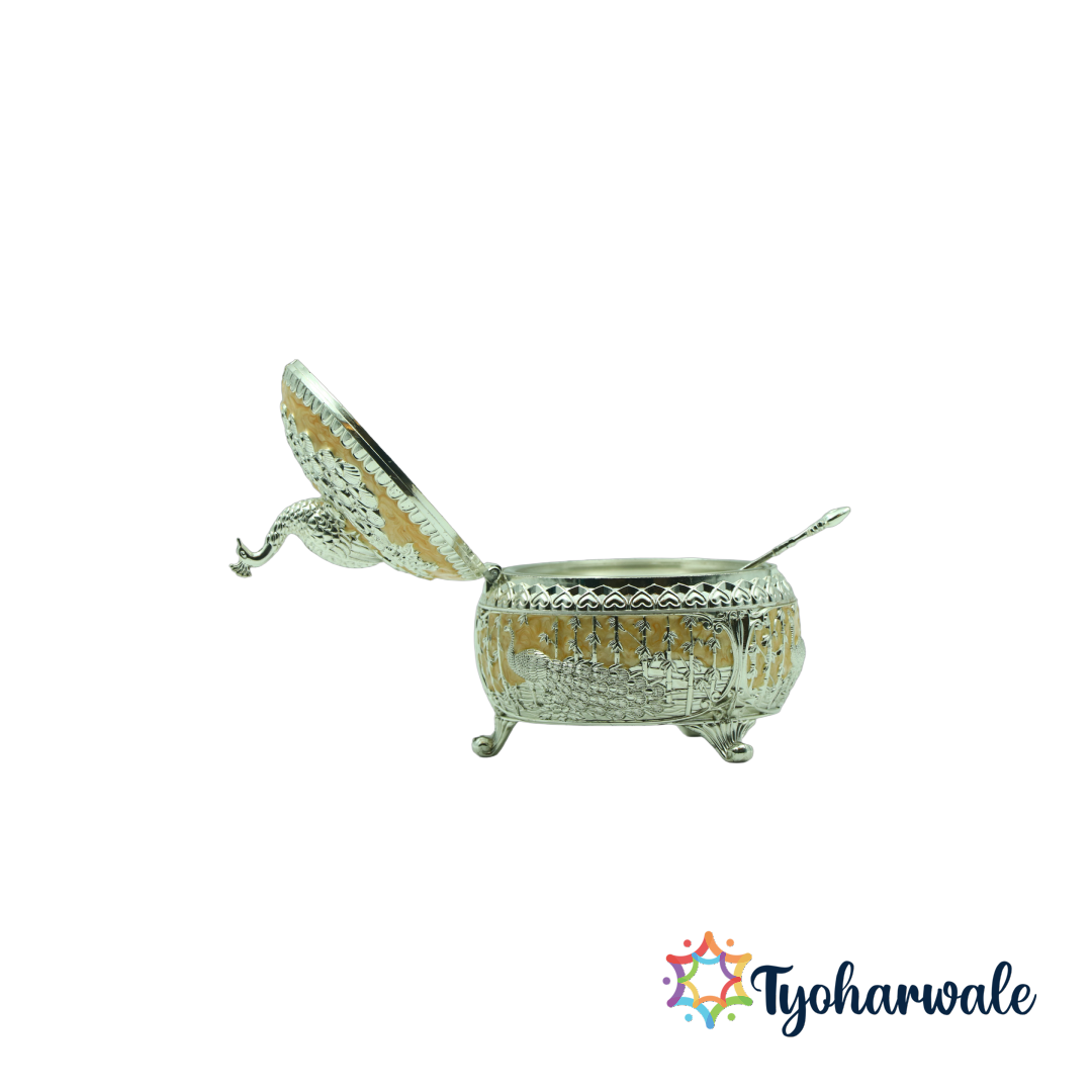 Available on Tyoharwale, this peacock container is part of  collection of premium festive storage, traditional gift boxes, decorative containers, Diwali essentials, and luxury pooja accessories.