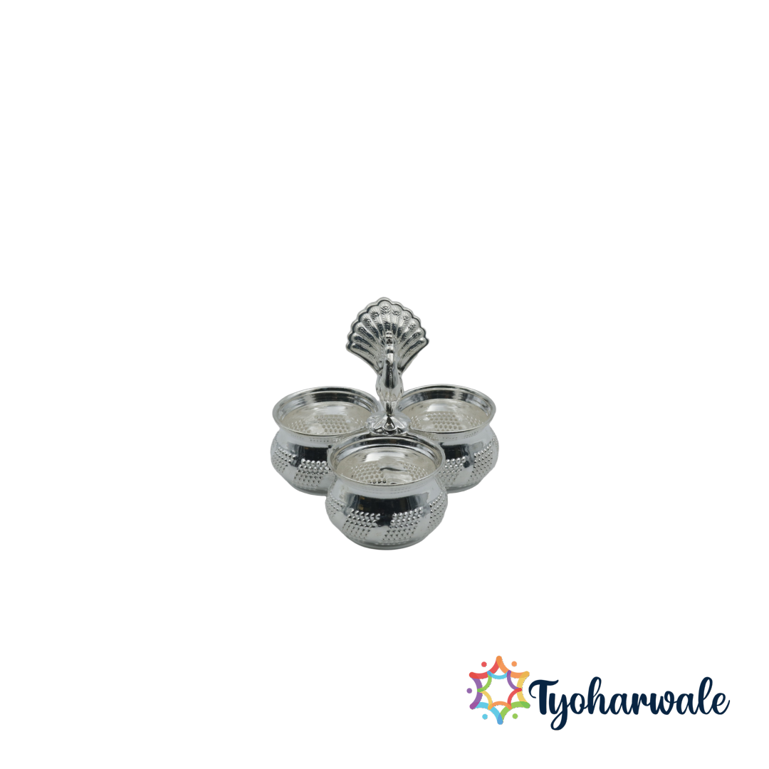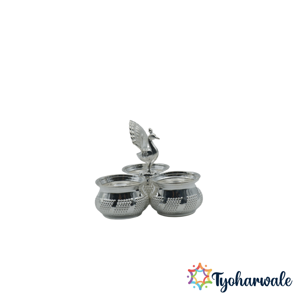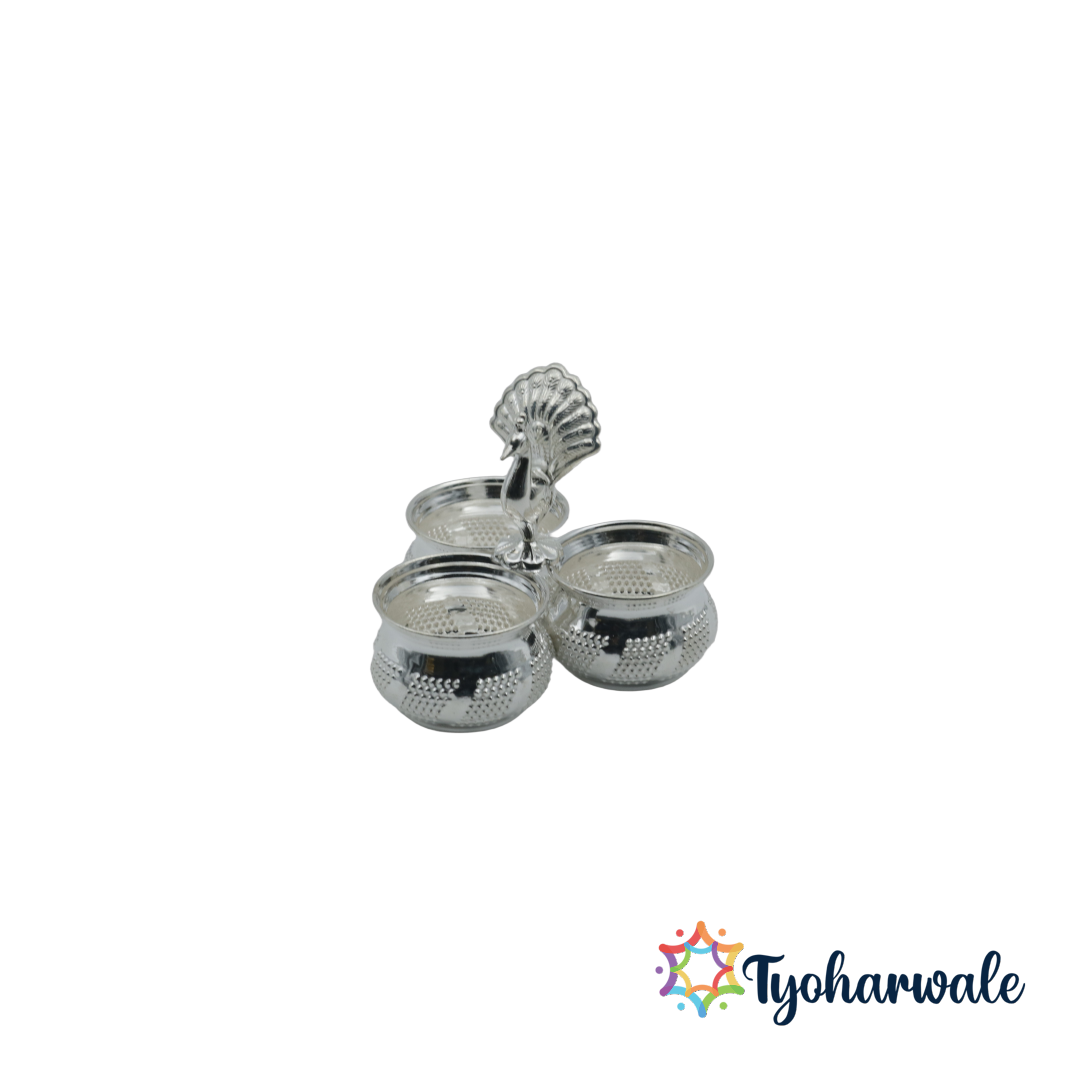Order 3 bowl peacock design panchapali in Delhi, buy haldi kumkum holder in Mumbai, purchase silver roli chawal stand in Bangalore, shop panchwala pooja set in Chennai, buy chowpala haldi kumkum set in Hyderabad, purchase peacock pooja bowl in Kolkata, shop silver pooja gift item in Pune, order 3 bowl peacock design panchapali online in Ahmedabad and other major cities. Explore the best pooja items near me and bring home a Pure Silver 3 Bowl Peacock Design Panchapali that enhances every ritual and sacred occasion.