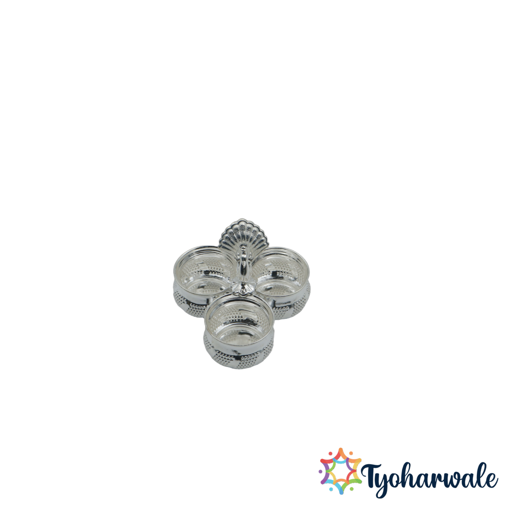 Elevate your pooja rituals with this Pure Silver 3 Bowl Peacock Design Panchapali, crafted for home, temple, and office use. This silver haldi kumkum holder features three elegantly designed bowls, perfect for roli, chawal, haldi, kumkum, chandan, and other pooja essentials. Ideal for daily pooja, religious ceremonies, festivals, weddings, Diwali, and housewarming occasions, this panchwala set is both decorative and functional, making it a thoughtful spiritual gift item.