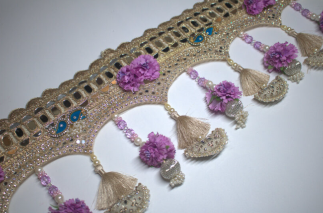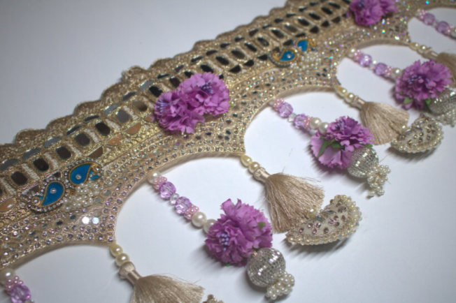 The combination of purple flowers and mirror detailing symbolizes creativity, prosperity, and positivity, making this decorative toran a meaningful addition to your rituals. Perfect for Lakshmi-Ganesh pooja, Diwali nights, wedding ceremonies. Pair it with rangoli designs, diya platters, flower garlands, and LED lights for a complete celebratory setup. This toran also makes a thoughtful and luxurious gift for friends and family. Ideal for Diwali gifting, wedding presents, housewarming hampers, or temple décor gifts. Each handcrafted detail ensures your gift is unique, vibrant, and perfect for bringing blessings, elegance, and festive joy to any home.