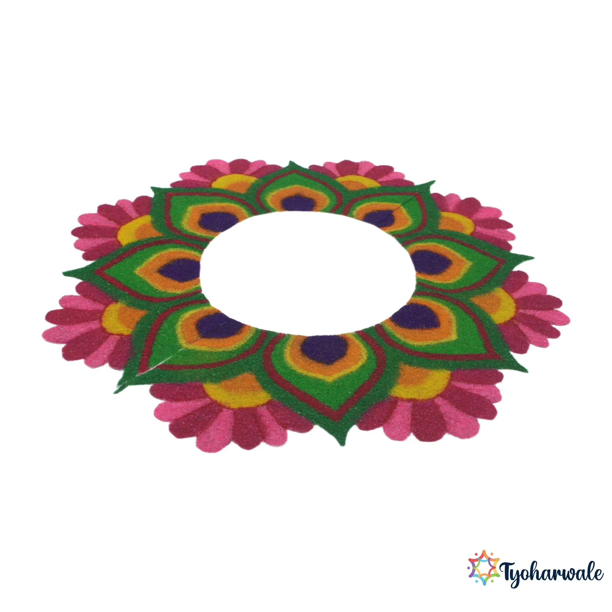 This decorative rangoli is suitable for main door decoration, apartment entrances, mandir areas, and event setups. The peacock-inspired design is commonly associated with beauty, positivity, and celebration, making it a popular choice for festivals, housewarming ceremonies, and cultural occasions. It offers a neat and mess-free alternative to drawing rangoli with powder while still enhancing the festive atmosphere.