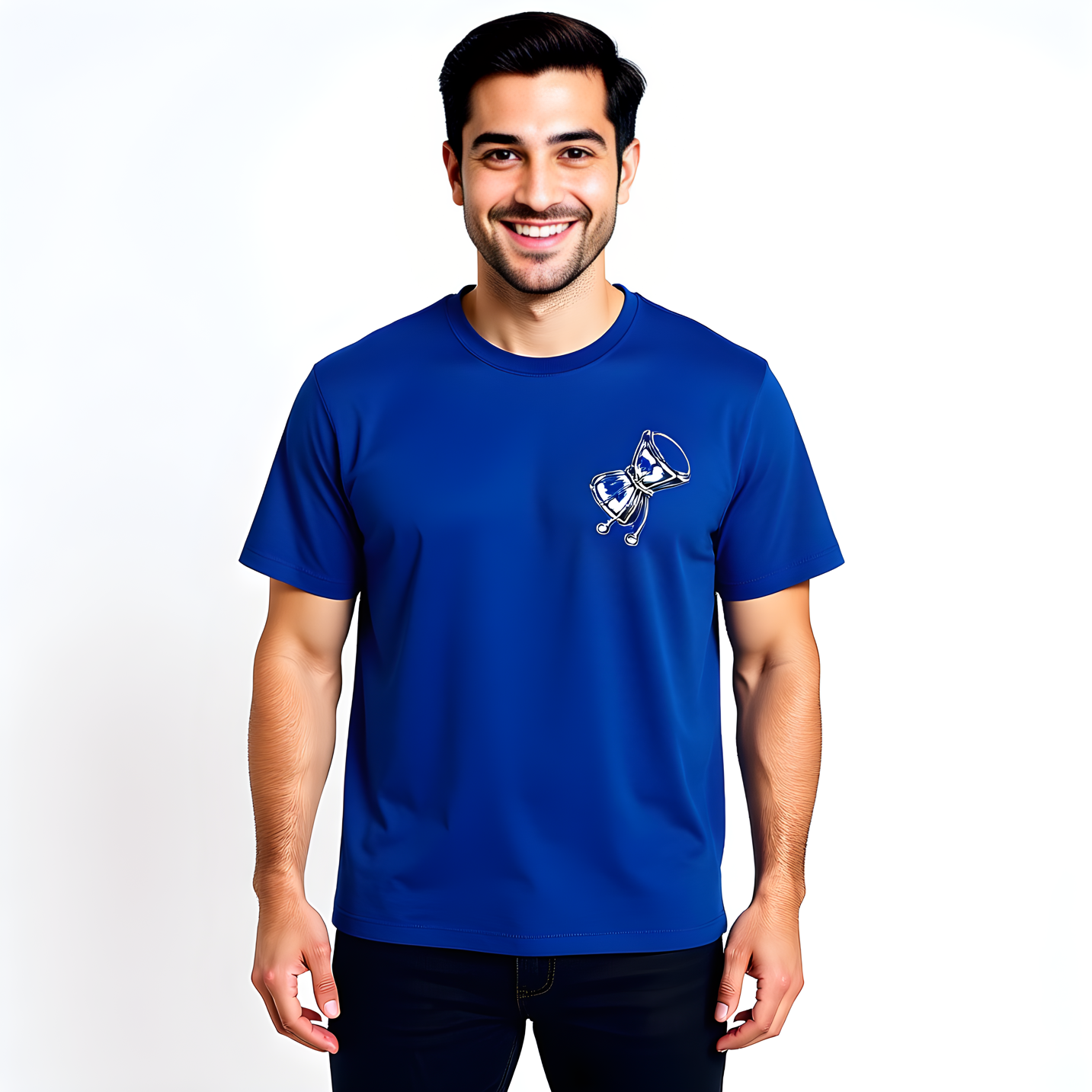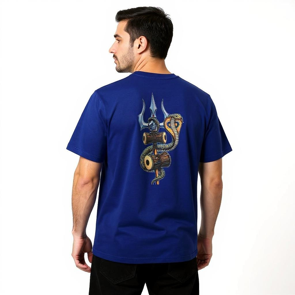This T-shirt features a vibrant blue color with a detailed graphic symbol of lord Shiva. The shirt has an oversize, relaxed fit suitable for everyday wear.