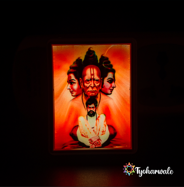 This Spiritual night lamp of Shri Gurudev Datta, Swami Samarth and Shankhar Maharaj by Raka Frames, available at Tyoharwale. This LED plug-in smart night lamp combines spiritual elegance with modern design. Ideal as a night lamp for pooja room, for creating a calm vibe at home, or even for focus in the office, these plug-in lights fit beautifully into your sacred spaces or work corners. The Shankhar Maharaj Night Lamp is a graceful blend of devotion and warm lighting.