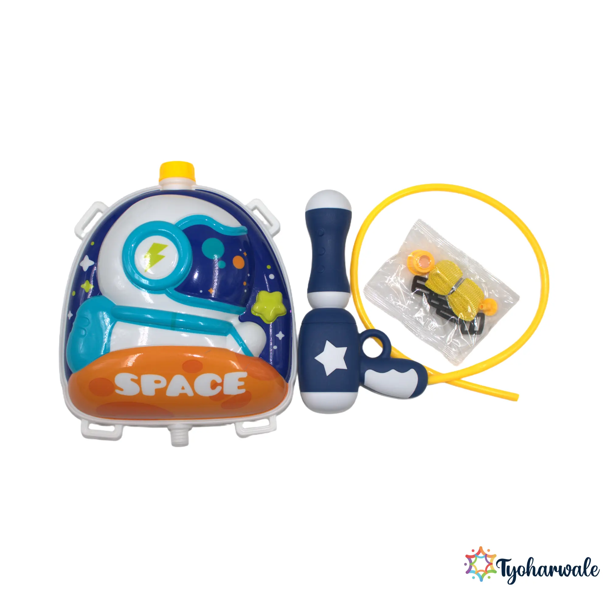 A space-themed backpack, a water tank gun designed for extended Holi celebrations. Supports longer outdoor play with fewer refills.
