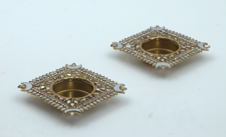 Elevate your festive décor with this elegant Square Metal Diya set with intricate mirror work. The reflective surface of each diya beautifully enhances the glow of the flame, casting a warm and inviting light. Perfect for Diwali, weddings, pooja ceremonies, or festive home décor, these diyas add charm and sophistication to any space. Their square design blends traditional symbolism with contemporary style, making them stand out on pooja thalis, rangolis, or as centerpieces.