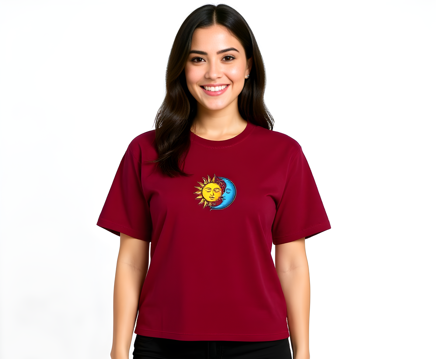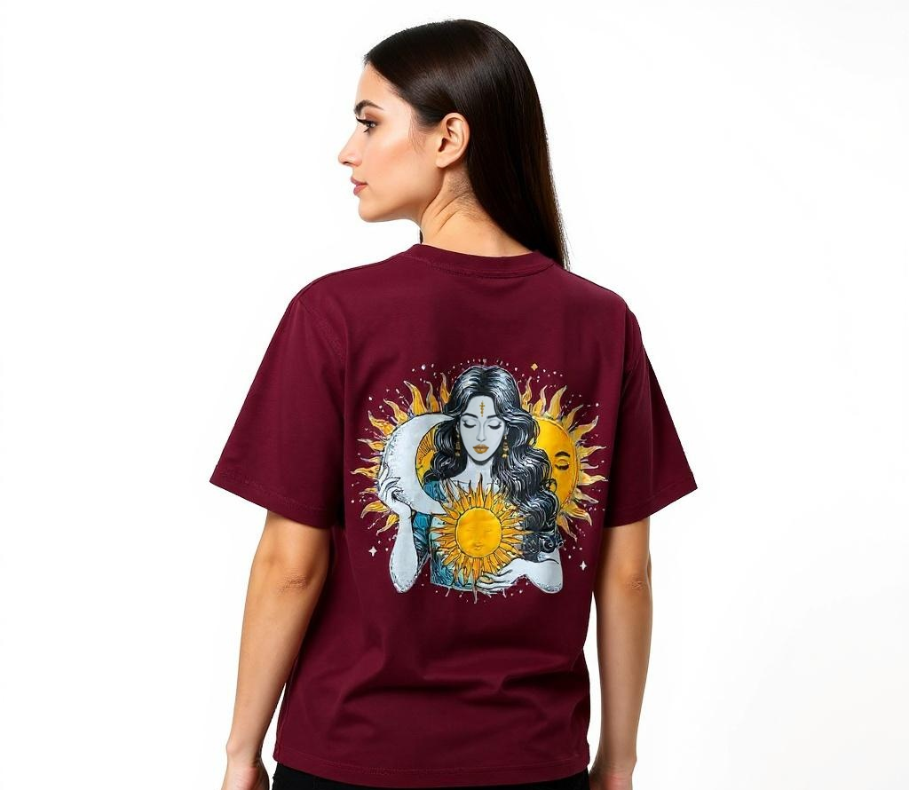 This  T-shirt features a vibrant graphic design of Sun and Moon. The shirt has an oversize, relaxed fit that is comfortable for everyday wear.