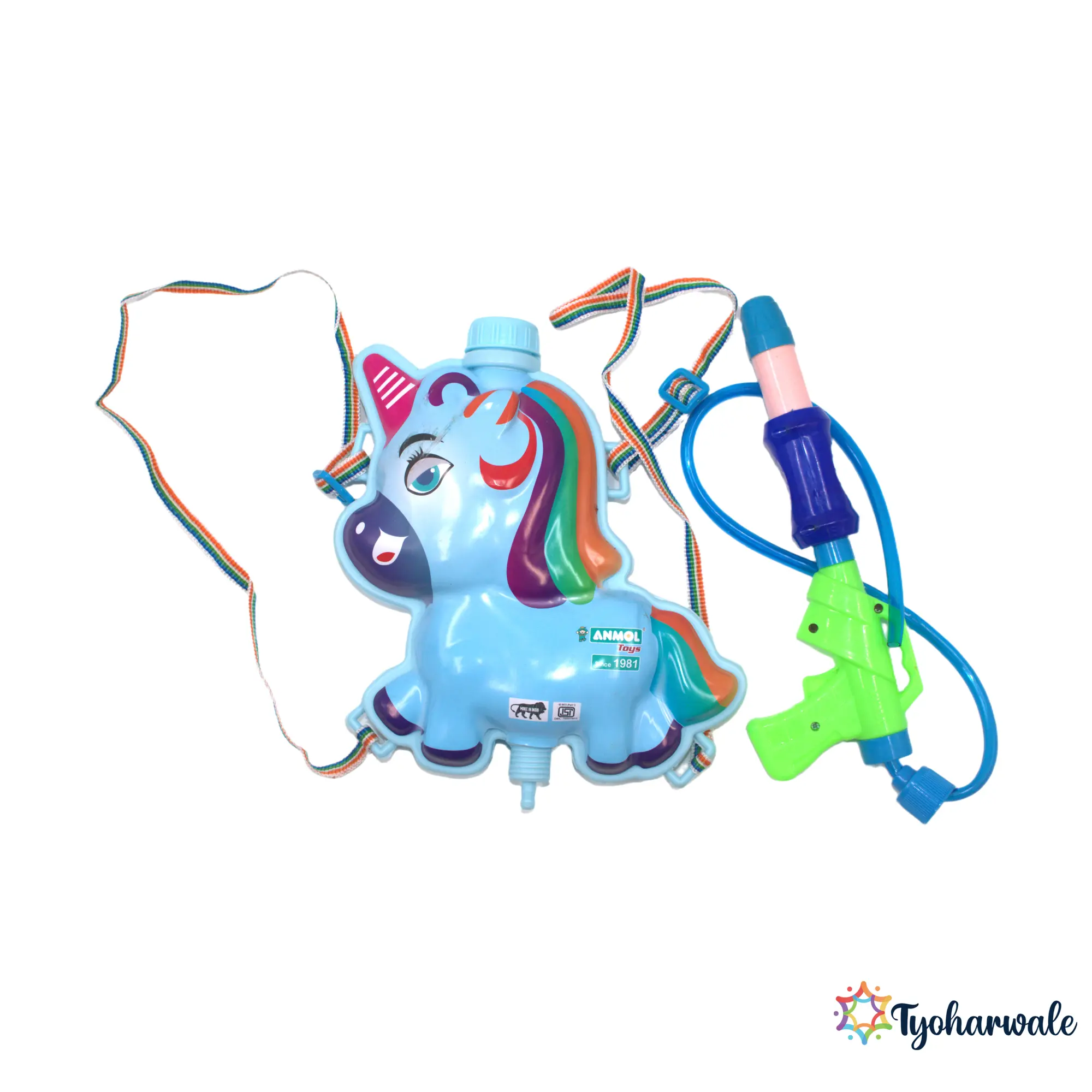 A playful unicorn pony water tank gun featuring a backpack design for extended Holi celebrations. Perfect for terrace gatherings and festive outdoor fun.