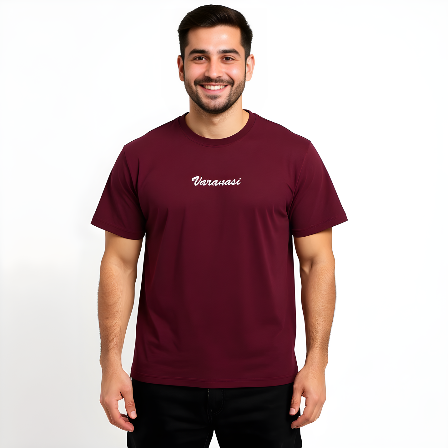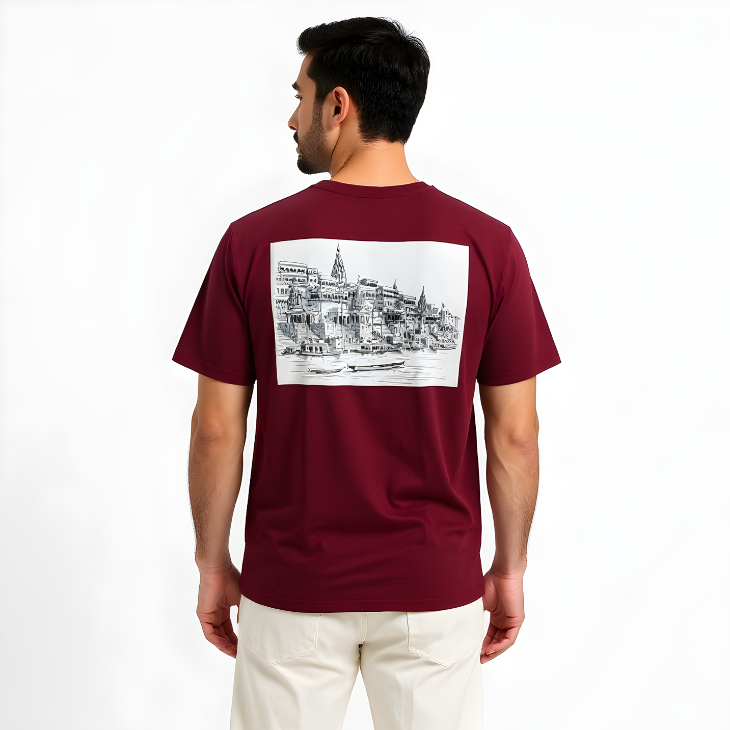 This T-shirt features a detailed black and white cityscape of Varanasi print on the back. The shirt has an oversize, relaxed fit that is comfortable for everyday wear.